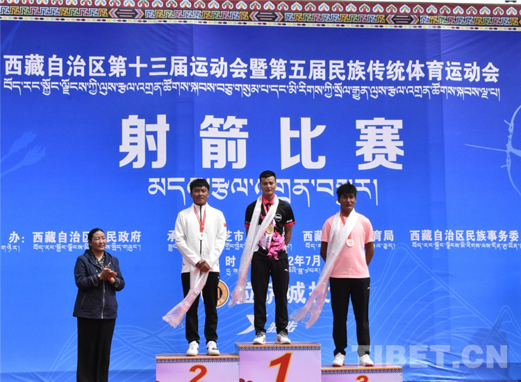圖為7月29日,男子個人70米雙輪賽頒獎現(xiàn)場,中間為冠軍選手林芝市代表團運動員嘎瑪江村,其右為亞軍選手拉薩市代表團運動員瓊達次仁,其左為季軍選手教育代表團運動員旦增羅布 攝影:拉姆