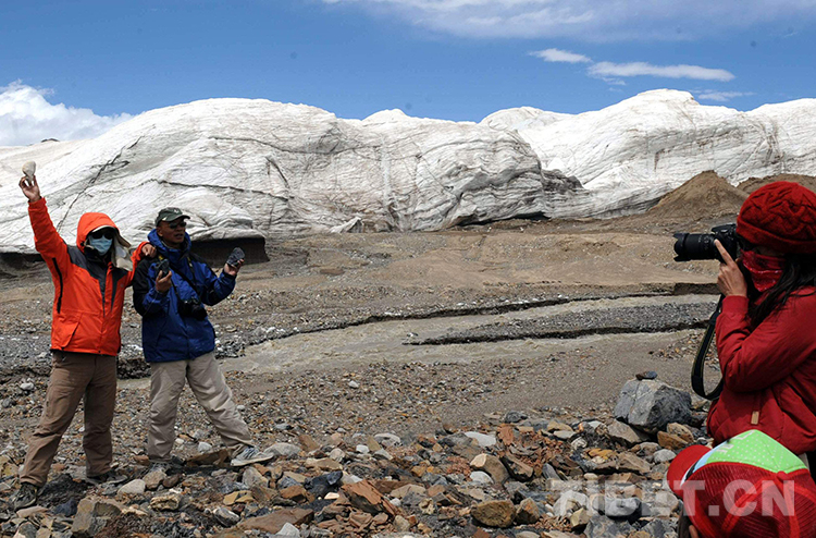 這是游客在壯美的普若崗日冰川前游覽(唐召明2009年攝)