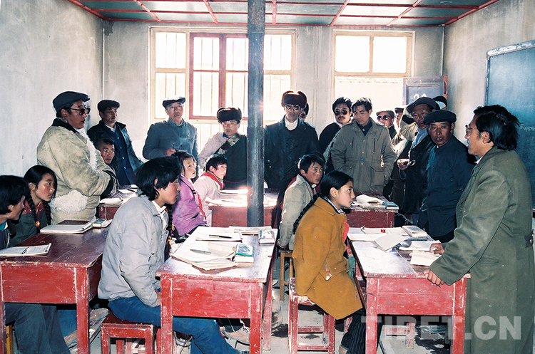這是那曲地區(qū)“訪問團”人員在參觀文部辦事處小學(唐召明1989年12月份攝)