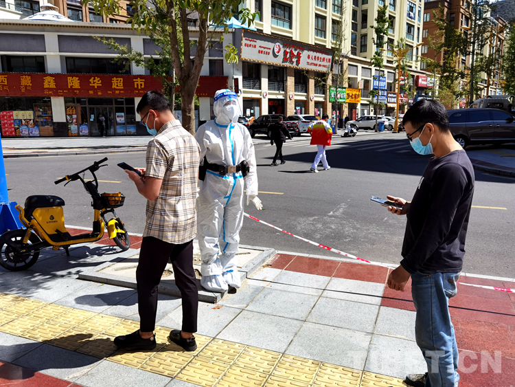 林芝邊境管理支隊機關(guān)民警曹婷正在核酸檢測點維護現(xiàn)場秩序 攝影:張航