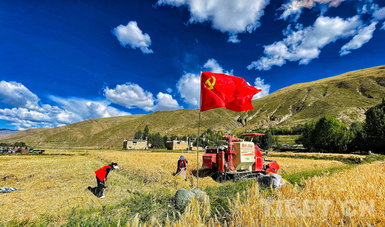 圖為瓊結(jié)縣拉玉鄉(xiāng)黨員志愿先鋒隊(duì)在該鄉(xiāng)強(qiáng)吉村二組幫助村民收青稞。多吉攝
