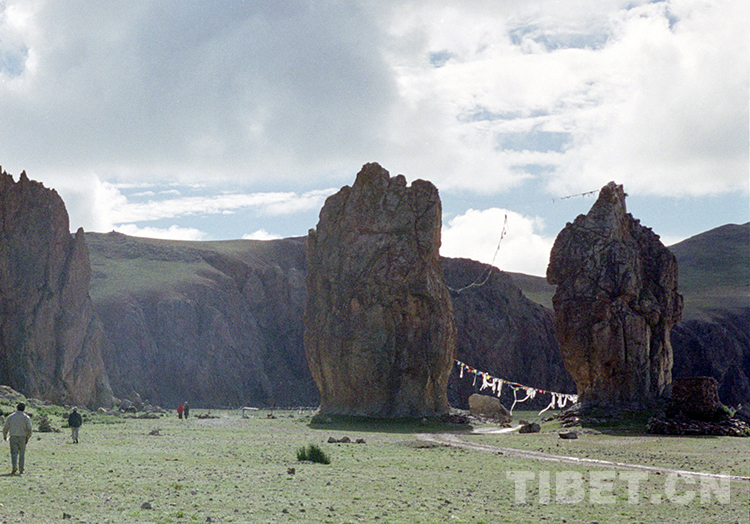 這是納木錯(cuò)扎西多島的迎賓石柱景觀(唐召明2001年攝)