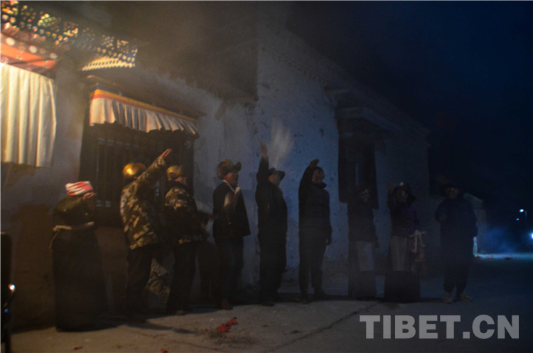 圖為查斯一家和鄰居在古突夜時(shí)一起拋灑糌粑祈福 攝影:歐帆