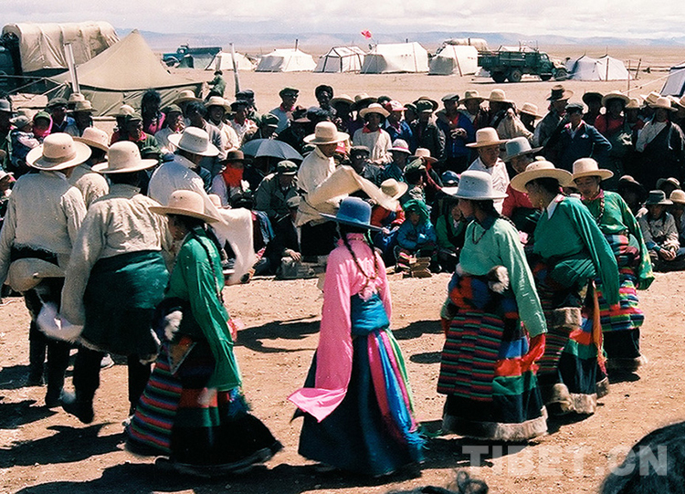 這是在那曲地區(qū)文部辦事處(現(xiàn)那曲市尼瑪縣)所舉行的傳統(tǒng)賽馬會(huì)上,牧人們跳起歡快的“鍋莊”舞(唐召明1987年攝)