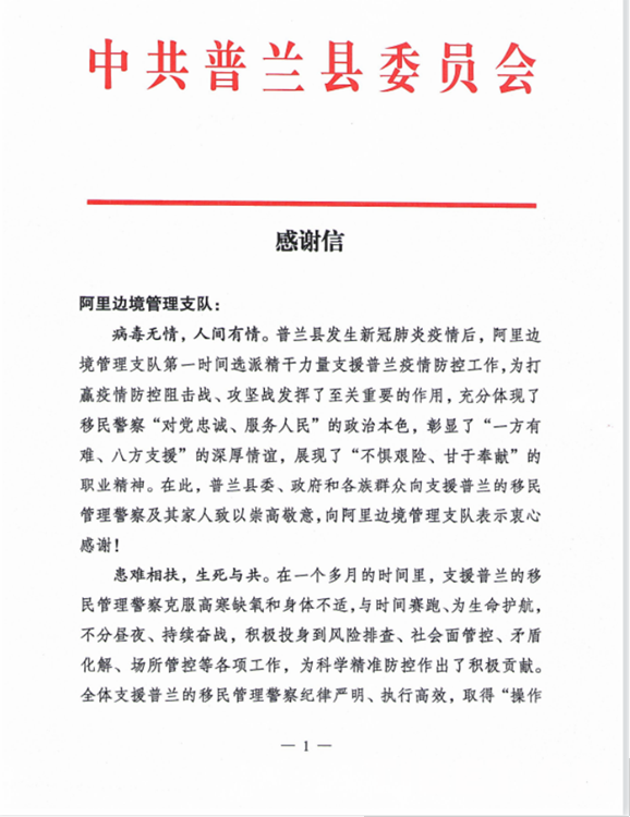 中國西藏網(wǎng)訊 “普蘭縣發(fā)生新冠肺炎疫情后,阿里邊境管理支隊第一時間選派精干力量支援普蘭疫情防控工作,為打贏疫情防控阻擊戰(zhàn)、攻堅戰(zhàn)發(fā)揮了至關(guān)重要的作用?!?0月2日,西藏自治區(qū)阿里邊境管理支隊收到一封來自阿里地區(qū)普蘭縣委的感謝信。信中對阿里邊境管理支隊?wèi)?zhàn)“疫”一線民警在一個多月的疫情防控工作中,克服困難、勇于擔(dān)當(dāng)、不分晝夜、持續(xù)奮戰(zhàn)的抗疫工作表達(dá)了感謝,給予了肯定。