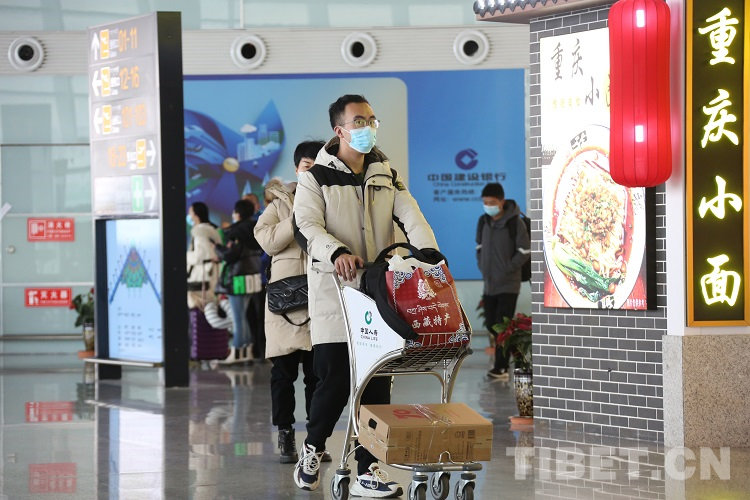 圖為在拉薩貢嘎機(jī)場內(nèi)旅客攜帶西藏特產(chǎn)準(zhǔn)備登機(jī) 攝影:王佳豪