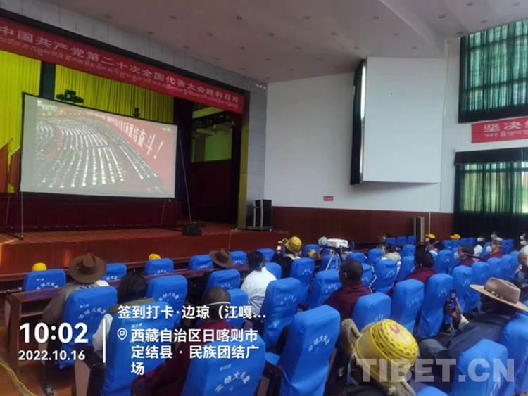 圖為10月16日上午,西藏自治區(qū)日喀則市定結(jié)縣各族干部群眾收看黨的二十大開幕會直播