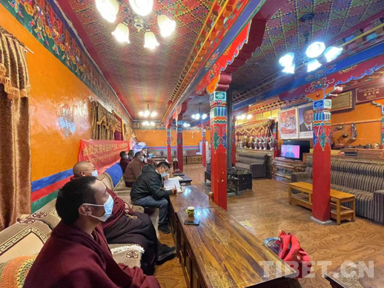 圖為10月16日上午,西藏自治區(qū)日喀則市定結(jié)縣曲果德慶林寺僧眾、駐寺干部在一起收看黨的二十大開幕會直播