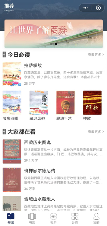 “掌讀西藏”為讀書公益類平臺,免費向讀者提供中國西藏主題的電子圖書。目前有《古格王國》《神歌》《達賴喇嘛轉世制度》《班禪額爾德尼傳》《拉薩掌故》《雪域山水藏地人》《節(jié)慶四季》《西藏歷史圖說》《進軍西藏日記》等29本電子圖書。這些電子圖書都是作者寶貴的知識結晶,也是對中國西藏珍貴的歷史記憶,濃縮了幾代人見證中國西藏發(fā)展的時代烙印。