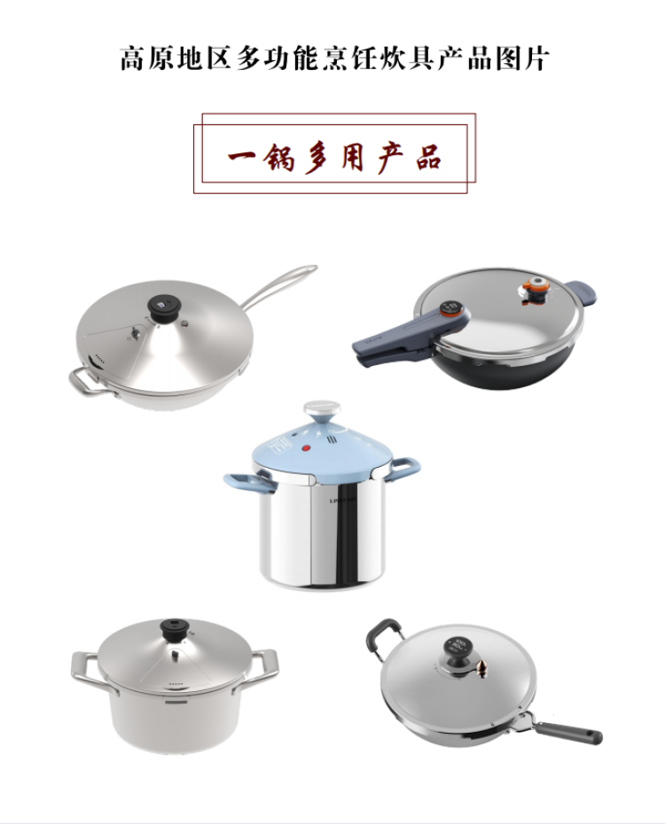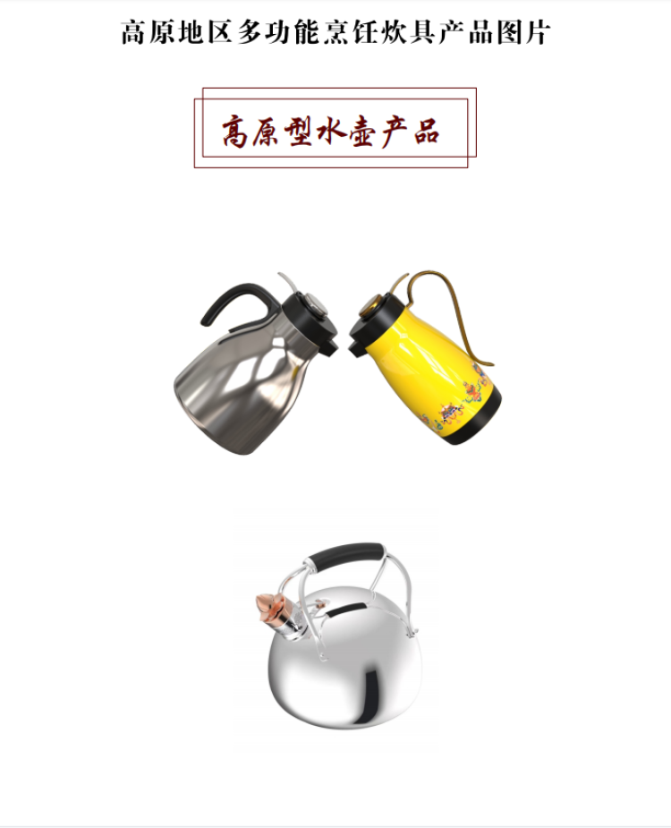 西藏自治區(qū)海拔跨度大,人民群眾生活范圍主要在800米至5000米左右,針對不同海拔高度需要不同烹飪壓力及不同烹飪時間的需求,研發(fā)的高原地區(qū)多功能烹飪炊具可實現(xiàn)一鍵調(diào)壓、多檔控壓和感溫定時功能。新研發(fā)的壓力鍋針對不同的海拔地區(qū)可以實現(xiàn)不同的壓力控制,從而在不同的沸點均能快速煮熟食物,實現(xiàn)與區(qū)外煮熟時間相同,且兼具口感,并保留食物更多的營養(yǎng)成分。新研發(fā)的高原地區(qū)專用燒水壺(明火款、電子款)也實現(xiàn)了在不同海拔地區(qū)均能與區(qū)外相同時間使壺內(nèi)水沸騰后達(dá)到100℃,從而保障高原地區(qū)廣大群眾都能喝上燒開的水。