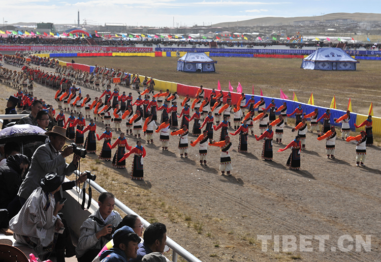這是來自那曲地區(qū)(現(xiàn)那曲市)各縣代表隊在進(jìn)行入場式表演。當(dāng)日,那曲賽馬藝術(shù)節(jié)在藏北首府那曲鎮(zhèn)開幕(唐召明2013年8月10日攝)