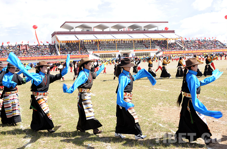 這是參加賽馬會的牧民群眾在新建的那曲民族體育賽馬場跳起大型“鍋莊”舞(唐召明2013年8月10日攝)