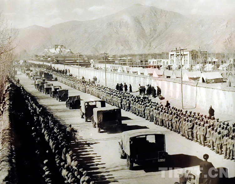 1954年12月25日,汽車第一次開進(jìn)拉薩。當(dāng)天,青藏、川藏公路正式通車,兩隊(duì)350多輛汽車披紅掛彩會(huì)師布達(dá)拉宮廣場(唐召明翻拍照片)