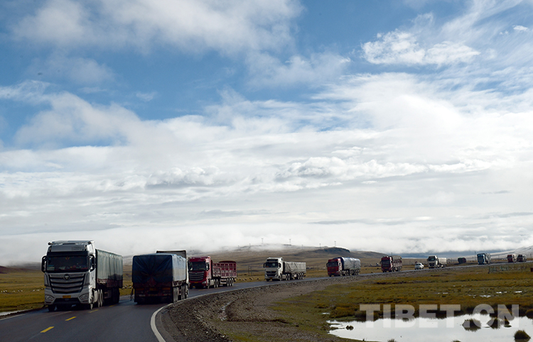 這是行駛在青藏公路安多縣路段的一輛輛重載卡車(唐召明2015年8月12日攝)