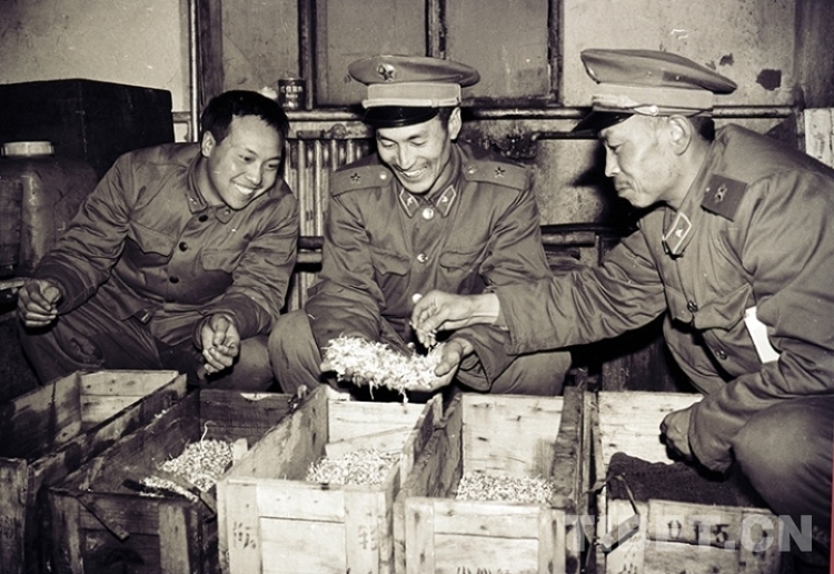 這是青藏公路五道梁兵站官兵在觀看自己新生產(chǎn)出的豆芽。在風(fēng)雪青藏公路線上,它豐富了過往人員就餐的“菜盤子”(唐召明1987年攝)