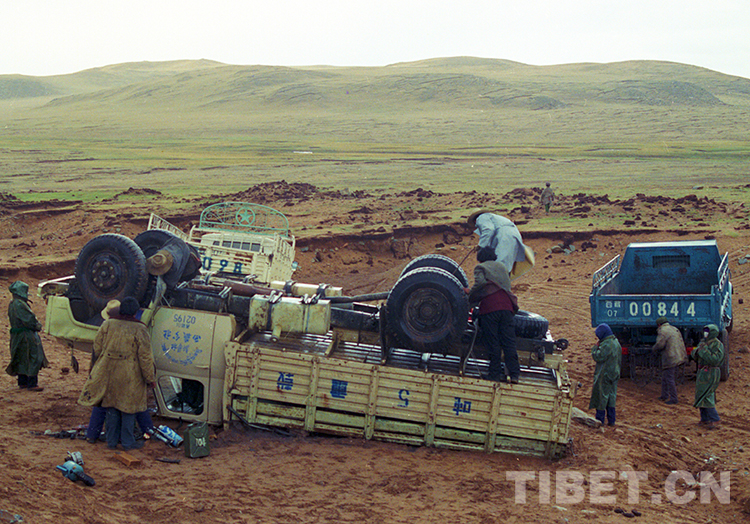 這是作者從西藏調(diào)到北京工作,所乘坐的“東風(fēng)”牌卡車不幸在唐古拉山下翻車,得到了青藏公路安多養(yǎng)護(hù)段巴恰等道班工人的鼎力相助(唐召明1991年攝)