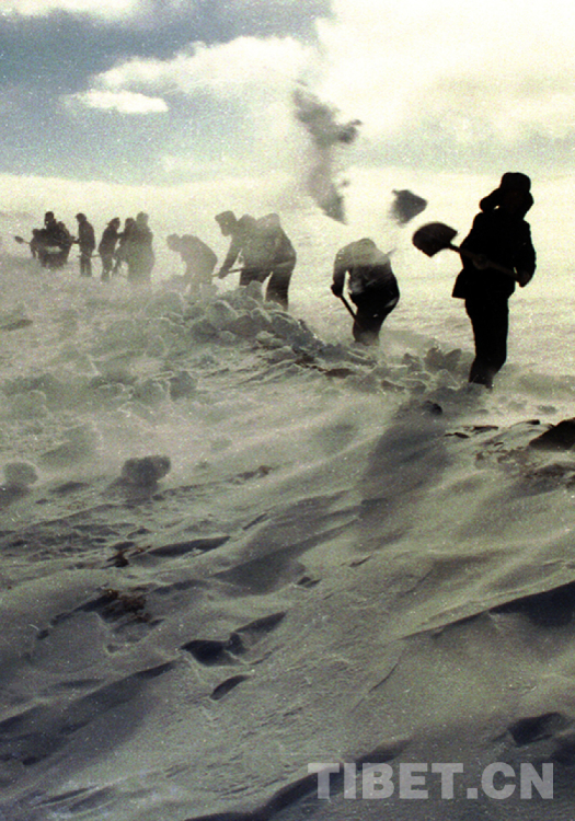 這是109道班工人在風(fēng)雪中鏟雪開路,確保青藏公路的暢通(唐召明1990年冬攝)