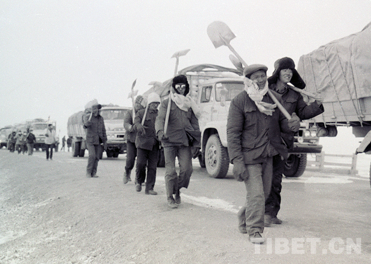 1954年5月11日,昔日鮮有人跡的唐蕃古道一下子變得熱鬧起來。在冰天雪地之中,一座座營帳扎起來。在海拔5200多米的唐古拉山頂30多公里路段,6個(gè)施工隊(duì)分段作戰(zhàn),到處響徹雄壯的勞動(dòng)號(hào)子。人們用鎬頭刨,鋼釬撬,鐵錘打,一點(diǎn)點(diǎn)地?fù)傅羟斑M(jìn)路上的堅(jiān)石硬土。