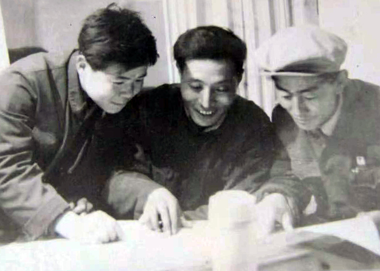 這是李業(yè)壯(左)在那曲地區(qū)農(nóng)機廠工作時,與藏族副廠長典地(中)、藏族技術(shù)員覺吉(右)一同研究開發(fā)新產(chǎn)品 (唐召明提供,1978年攝)