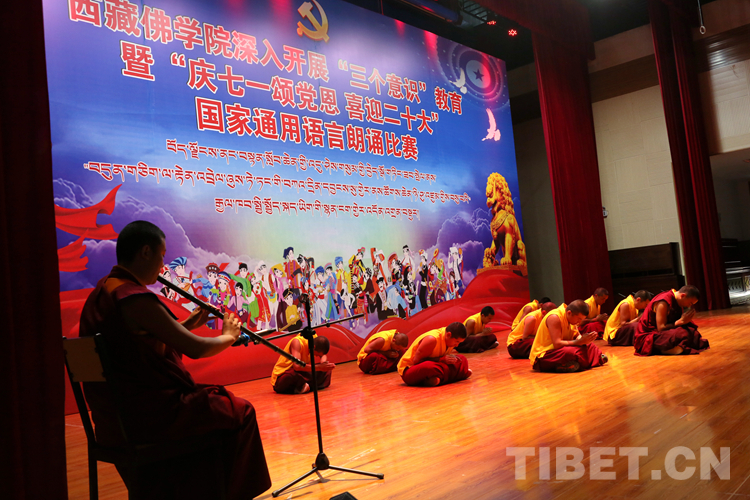 圖為2022年7月1日,西藏佛學(xué)院舉行的“慶七一頌黨恩 喜迎二十大”國家通用語言朗誦比賽現(xiàn)場由2021級學(xué)制班學(xué)員表演笛子獨奏《我愛你中國》和瑜伽表演 攝影:王佳豪