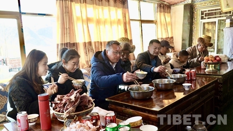 “這些干部和我們相處了這么長(zhǎng)時(shí)間,都成自家人了。他們家在內(nèi)地,但因?yàn)楣ぷ鞅仨殘?jiān)守崗位。我們能做的也不多,就是請(qǐng)他們到家中來(lái)吃個(gè)簡(jiǎn)單的團(tuán)圓飯?!?多章說(shuō)著,老人的女兒央金熱情地端來(lái)酥油茶。