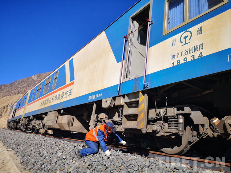 圖為工作人員檢測拉日鐵路的鋼軌是否存在內(nèi)部損傷