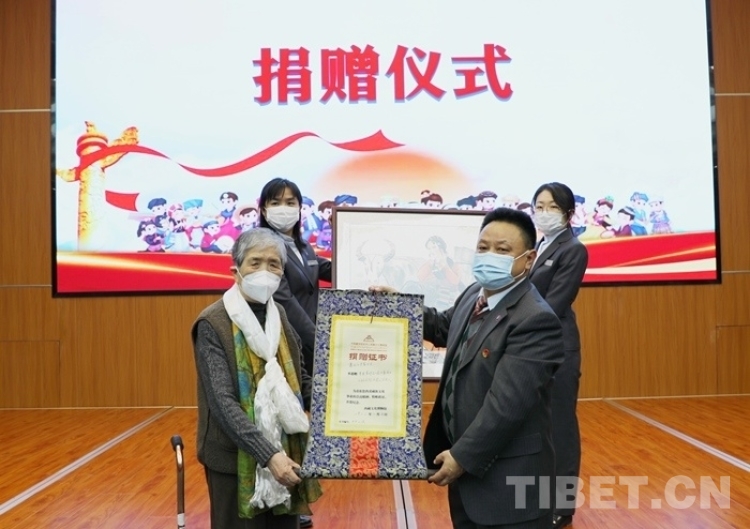 圖為中國藏學(xué)研究中心西藏文化博物館向畫家吳茜女士(左)頒發(fā)捐贈(zèng)證書