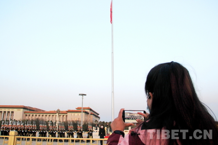 清晨6時(shí)許,軍樂(lè)團(tuán)在天安門廣場(chǎng)就位。“正步走!”隨著一聲響亮的口令,國(guó)旗護(hù)衛(wèi)隊(duì)邁著鏗鏘的正步,拱衛(wèi)國(guó)旗走過(guò)天安門城樓、金水橋?!跋驀?guó)旗敬禮!”6時(shí)9分,隨著響亮的口令,軍樂(lè)團(tuán)奏響了國(guó)歌《義勇軍進(jìn)行曲》,升旗手高高揚(yáng)起國(guó)旗,鮮艷的五星紅旗迎著朝陽(yáng)冉冉升起?!?023年西藏基層?jì)D聯(lián)干部赴京學(xué)習(xí)參觀團(tuán)”成員們紛紛用手機(jī)記錄下這難忘的時(shí)刻。