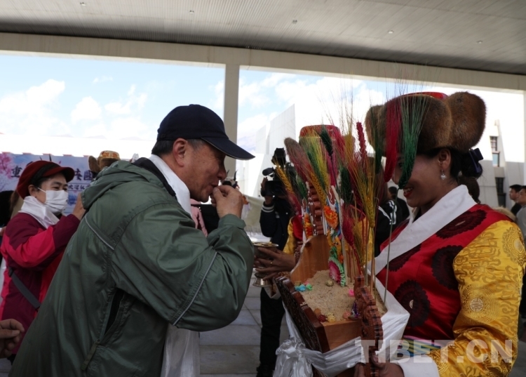 圖為歡迎儀式上,歡迎人員敬獻(xiàn)“切瑪”,歡迎“老西藏”。葉鵬(左)熟練地以藏族禮節(jié)回應(yīng) 攝影:王茜