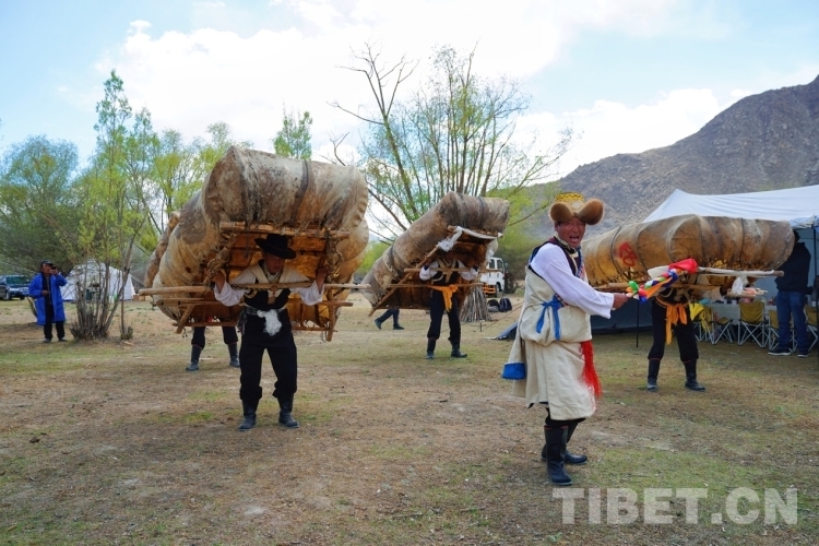 當(dāng)天恰好是周六,從拉薩來(lái)體驗(yàn)的游客不在少數(shù),有的是觀看了抖音直播就馬上騎車(chē)過(guò)來(lái)體驗(yàn)的。在營(yíng)地,大家欣賞到了當(dāng)?shù)氐摹肮挝琛保ㄅFご瑁?,廓孜由邊唱邊跳的“阿熱”和身背牛皮船跳舞的“船夫”合作表演?!鞍帷笔枪挝柚械念I(lǐng)舞者,跳牛皮船舞時(shí),“阿熱”手執(zhí)“塔塔”(五彩旗桿),唱著歌,跳著舞,另外4位舞者看著“阿熱”的動(dòng)作,背著重約80斤的牛皮船,用同樣的動(dòng)作跟著“阿熱”跳舞。大家動(dòng)作整齊,船漿擊打船舷的“咚咚”聲不絕于耳。