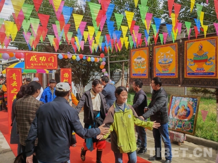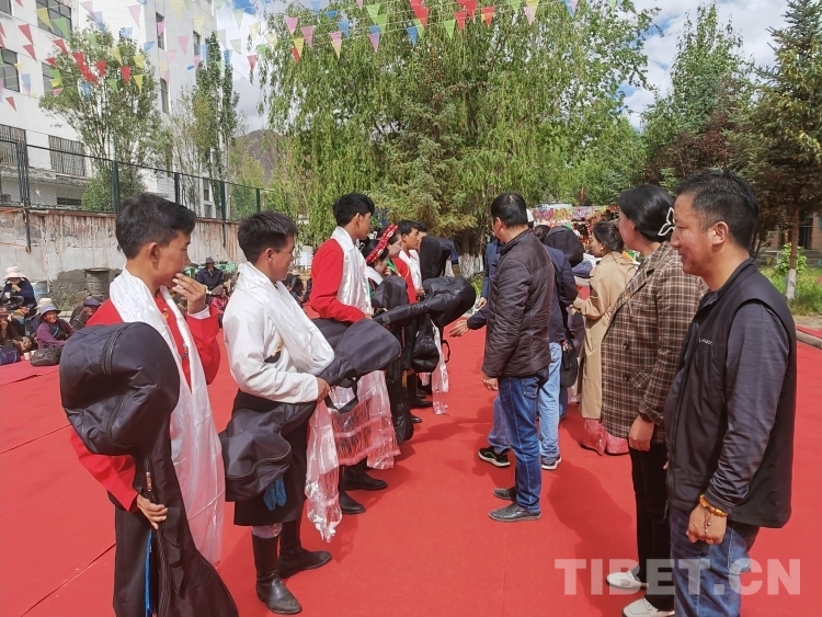 圖為學(xué)校為唐卡專業(yè)的學(xué)生贈送自己的唐卡作品和繪畫工具及顏料等