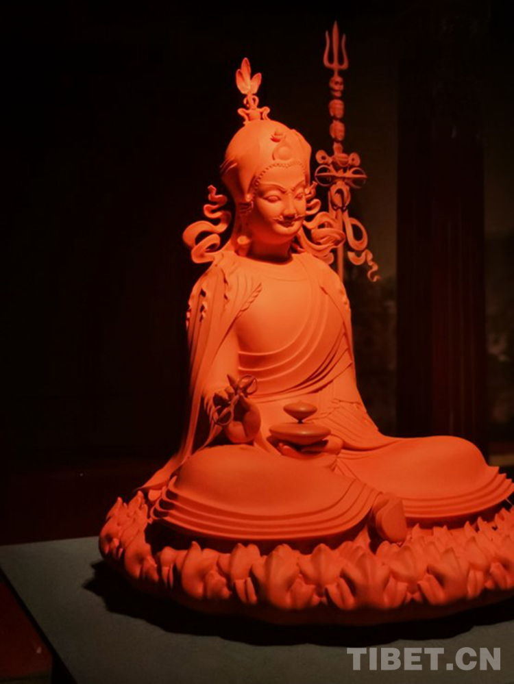 展覽還特別呈現(xiàn)了一件蓮花生大師坐像,回應(yīng)西藏歷史傳統(tǒng)中對智慧的尊崇。該作品座高一米,通體以紅色琉璃塑造,與古建筑廊道中清代晚期民眾面對外敵來襲、出于樸素愛國熱情而繪制的蓮花生大師壁畫形成呼應(yīng)。