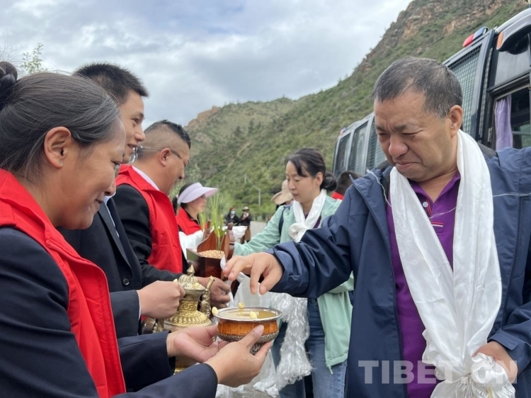 圖為當地干部群眾手捧吉祥切瑪和青稞酒迎接專家義診團。攝影:德吉卓瑪
