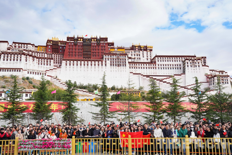 十月的拉薩秋高氣爽,云淡風(fēng)輕。升旗儀式正式開始前,布達(dá)拉宮腳下站滿了各地游客,他們有的揮舞著小旗,有的臉上貼著“我愛你中國”貼紙,期待著在海拔3650米的拉薩為祖國母親慶生。廣場內(nèi),西藏各族群眾身著節(jié)日盛裝,整齊肅立,共同期待五星紅旗冉冉升起的莊嚴(yán)時(shí)刻。