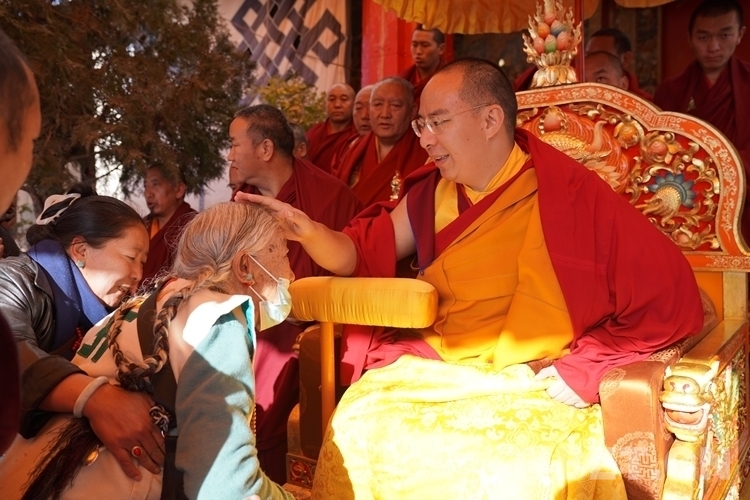 日喀則市桑珠孜區(qū)的索朗頓珠來(lái)到班禪面前,雙手合十將手持轉(zhuǎn)經(jīng)筒高高舉起,班禪見(jiàn)狀為其摸頂賜福,并為其轉(zhuǎn)經(jīng)筒開(kāi)光加持?!艾F(xiàn)在生活美滿,今天又得到班禪仁波切的摸頂賜福和加持,感覺(jué)特別幸福。”索朗頓珠搖動(dòng)著轉(zhuǎn)經(jīng)筒,戀戀不舍地回頭矚望。