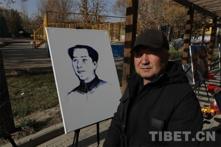 來(lái)到作畫(huà)區(qū)域,首先吸引記者注意的便是身穿黑衣、頭戴灰帽的西爾艾力·艾買(mǎi)提老人。在雪白的畫(huà)布前,老人用藍(lán)色和墨色顏料深淺描繪,勾勒出我們最熟悉的面孔。他向我們介紹說(shuō):“我畫(huà)的是我們偉大的毛主席年輕時(shí)候。沒(méi)有毛主席,我們中國(guó)人的生活不是這個(gè)樣子的,我很感恩他。我畫(huà)毛主席就是想讓更多人看見(jiàn),讓他的故事得到更好的緬懷?!?/span>