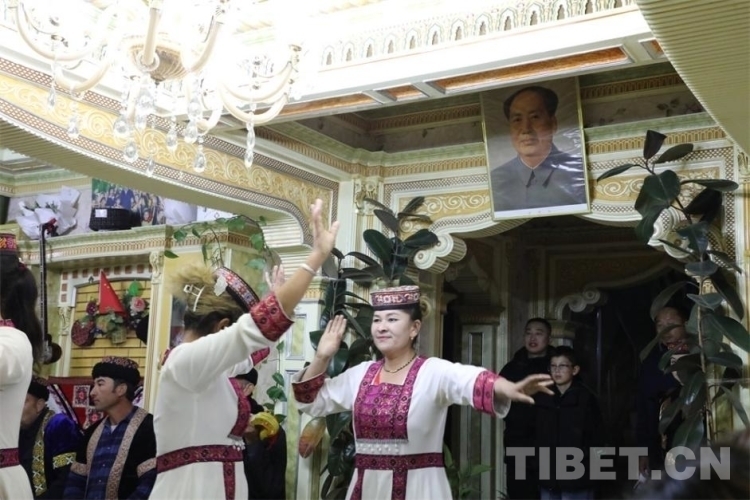 一路前行,在喀什地區(qū)澤普縣的布依魯克塔吉克風(fēng)情小鎮(zhèn),美輪美奐的獨(dú)棟小院是小鎮(zhèn)居民區(qū)的特色,在夕陽(yáng)的映襯下顯得格外溫馨舒適。好客的塔吉克族老人巴哈爾古麗·熱扎熱情地邀請(qǐng)走訪團(tuán)一行前往家里做客。穿過(guò)小院,一進(jìn)客廳就看見(jiàn)門(mén)廳上方懸掛著的毛主席畫(huà)像。當(dāng)所有人落座后,鷹笛聲響起,身穿塔吉克民族服飾的人們開(kāi)始翩翩起舞,充滿(mǎn)了載歌載舞的歡樂(lè)氣氛。