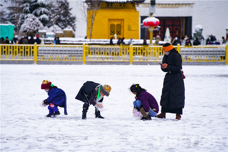 第四站,布達拉宮廣場。“給我一瓶礦泉水,我能還你兩座布達拉宮?!北绕鹗裁磿r候都可以在這里拍的布達拉宮倒影,雪中的布達拉宮廣場可謂是“可遇不可求”。南方的游客在這里激動地高喊“我終于見到雪了”,北方的游客抖抖肩膀上的雪花繼續(xù)拍攝下一組寫真,本地的藏族娃娃和小伙伴們一起追逐嬉戲,雪中的西藏和平解放紀念碑顯得更加巍峨。
