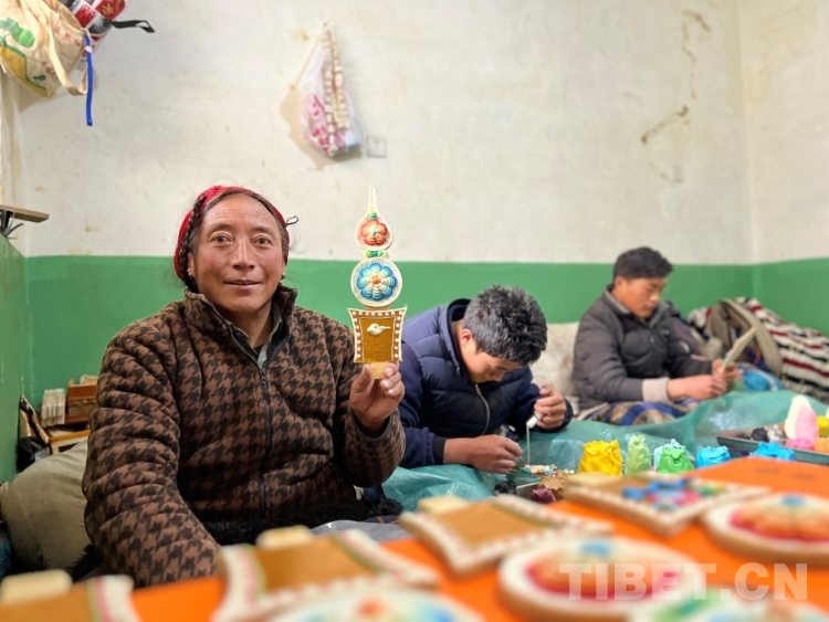 丹增朗杰每天和爸爸、大哥一起從早上8點左右開始捏制,一直持續(xù)到深夜24時許,按圖案復雜程度,一天可以捏制近7到10余對酥油花。“雖然有點辛苦,但我很喜歡寒假和家人一起來拉薩制作酥油花?!?/span>丹增朗杰說,他從14歲開始學習制作酥油花,覺得靠自己的勞動掙錢能讓自己擁有成就感。
