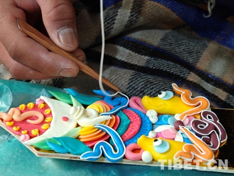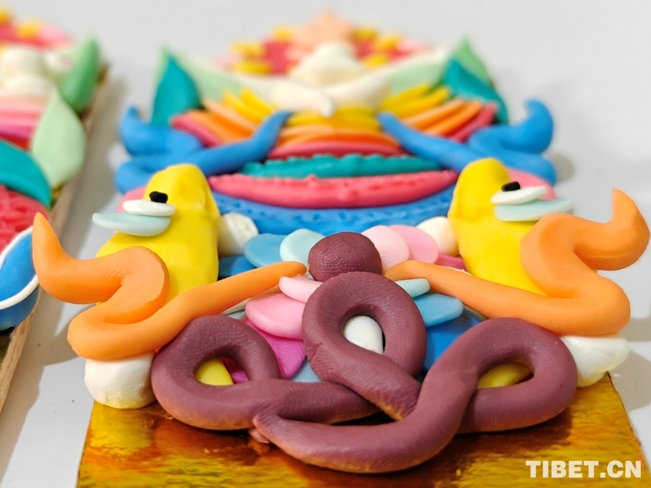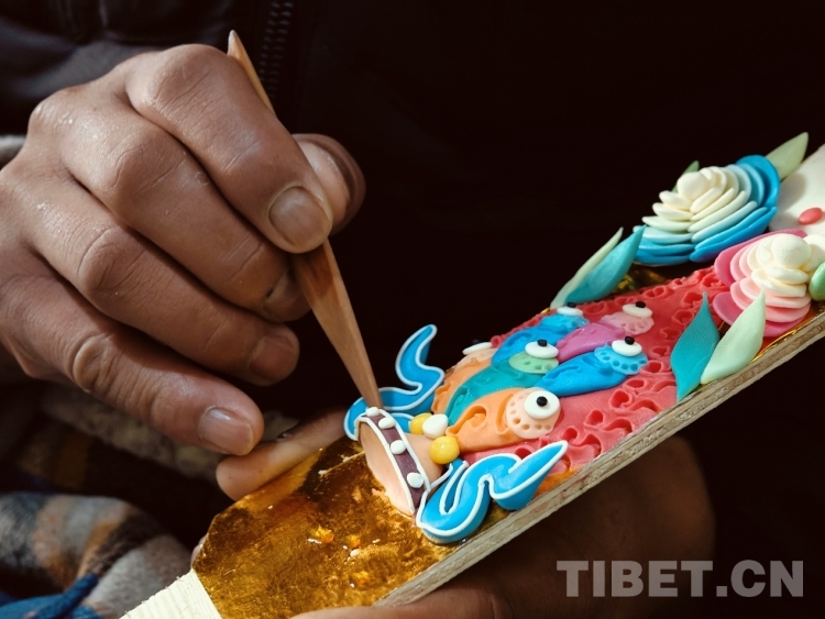 頓珠的二兒子丹增朗杰今年只有19歲,是一名高中生,但制作酥油花的手法已經極為嫻熟。他盤腿而坐,面前擺放著調制好的各色酥油和一盆清水。只見他捏取一小塊酥油在冷水中浸泡一會,然后熟練地用食指和拇指將酥油捏成不同形狀,粘貼于一塊盾形木板上,一對對色彩斑斕、寓意吉祥的酥油花作品便完成了。