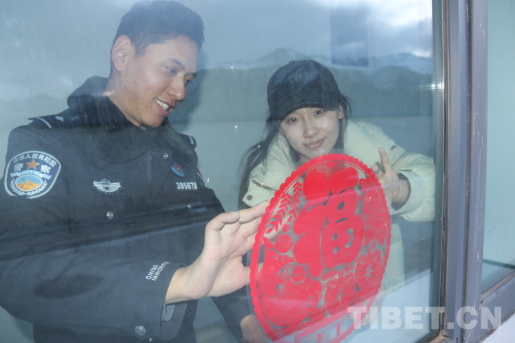 圖為洛追與永措一起裝點(diǎn)營(yíng)區(qū),貼窗花 攝影:鄭鵬飛