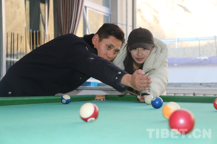 圖為單位陽(yáng)光房里洛追與永措切磋球技,洛追在旁耐心指導(dǎo) 攝影:鄭鵬飛