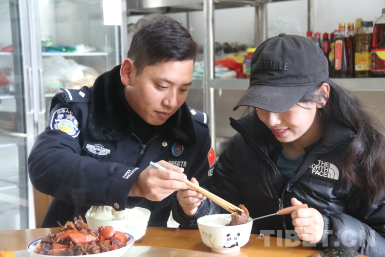 氧氣瓶、高原藥品、熱水......接德吉永措的車上已準(zhǔn)備好了各種抗高反和取暖的東西,這讓她提前感受到了來自丈夫單位的熱情與關(guān)懷。與愛人相聚后,旦增洛追帶著妻子參觀營(yíng)區(qū),迫切地想讓她了解他用青春為之奮斗的警營(yíng),隨后他又帶著妻子到單位食堂品嘗自己親自下廚做的紅燒肉。“嗯!味道很好?!钡录来氤灾煞蚪o她夾的肉,臉上洋溢著幸福的笑容。