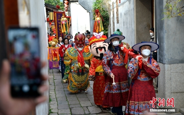 圖為福州三坊七巷天后宮舉行“迎財神”民俗巡游活動,吸引許多人駐足觀看。攝影:呂明