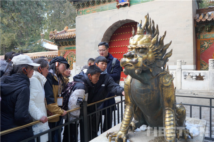 原來宮殿的排水系統(tǒng)既科學(xué)又美觀,原來屋脊神獸有避雷的作用,原來宮殿前的動(dòng)物造型香爐是古代版“舞臺(tái)干冰制造器”……故宮的建造元素如此豐富,來自各個(gè)地區(qū)和民族。隨著講解員的介紹,同學(xué)們被古人的智慧深深折服,對(duì)這座皇家園林有了了解和自己的認(rèn)識(shí)。站在宮殿的高處,學(xué)生們遙望到矗立的白塔,遙望到屋頂龍形裝飾的雨花閣,據(jù)說里面都是清朝皇帝收藏關(guān)于藏傳佛教的“寶物”,那里有關(guān)于西藏的歷史故事。