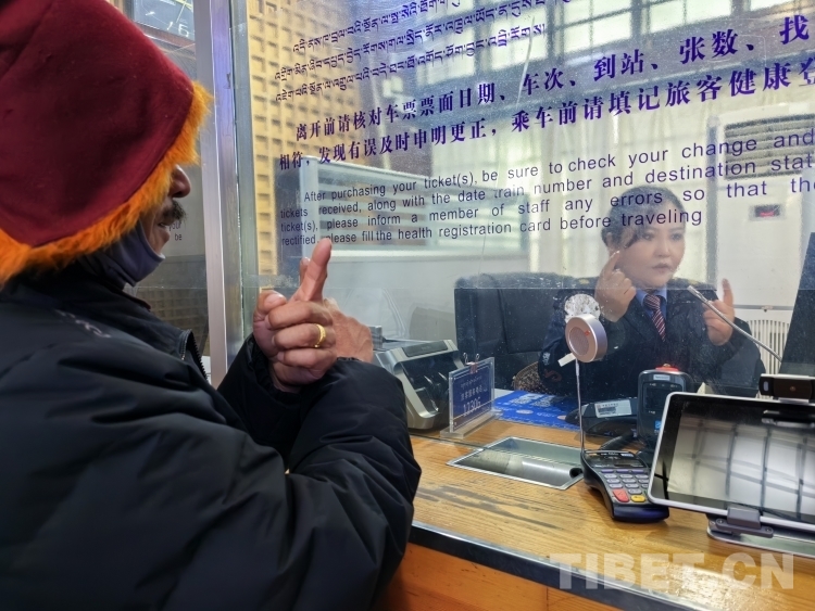 圖為李欣怡在拉薩火車站售票窗口用手語(yǔ)與旅客溝通