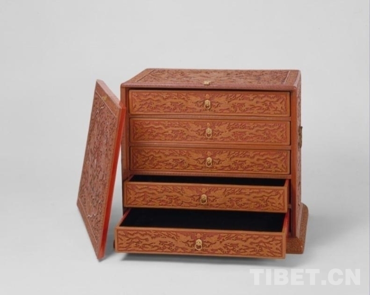 箱子兩側(cè)及蓋面紋飾與插門相同,僅龍紋為單龍戲珠。箱背面為綠色海水,上雕松鶴圖,鶴有六只,寓意“六合同春”“松鶴延年”。箱內(nèi)裝抽屜五具,無遮擋,寬寬敞敞,屜面雕云龍戲珠紋。底座雕纏枝小朵花卉紋。(中國西藏網(wǎng) 綜合/周晶)