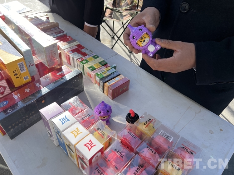 圖為西藏自治區(qū)煙草專賣局工作人員向來(lái)往群眾展示違規(guī)電子煙 攝影:德吉卓瑪