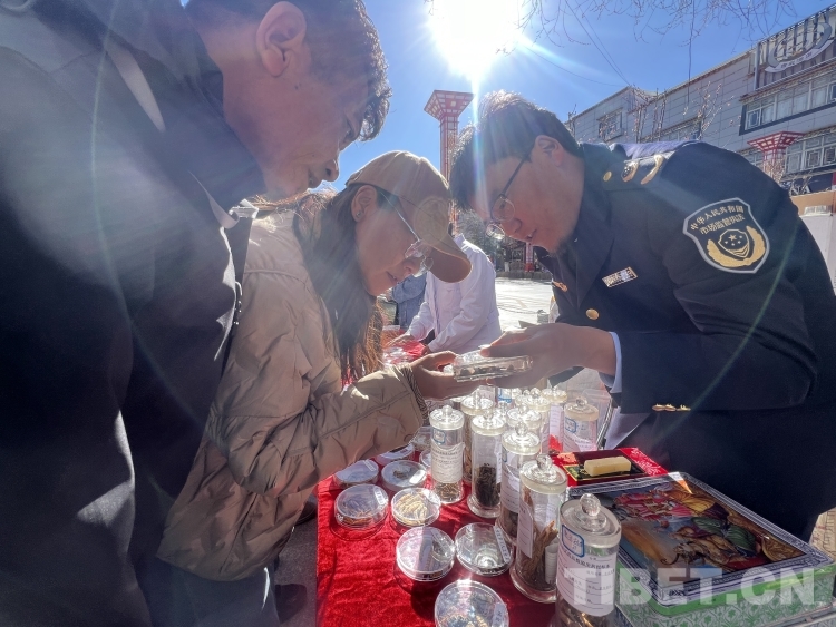 圖為市場(chǎng)監(jiān)管局工作人員向尼尼講解真假蟲草辨別方法 攝影:德吉卓瑪