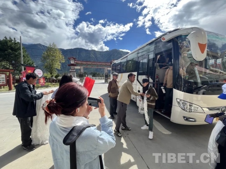 圖為門仲村工作人員為游客獻哈達表示歡迎
